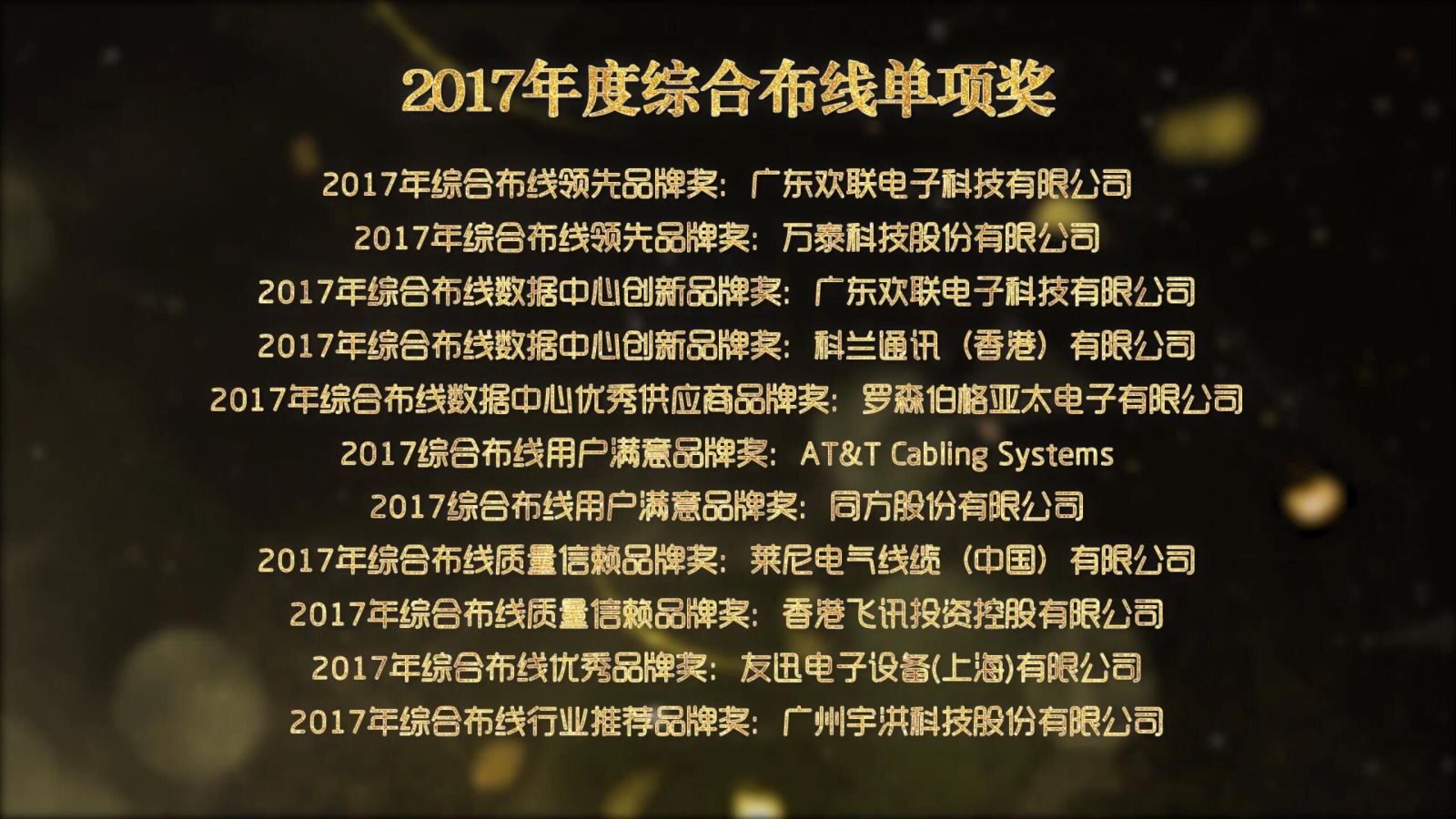 12月7日,伴隨著建筑智能化行業(yè)年度大型盛會——第18屆中國國際建筑智能化峰會的圓滿落幕,被譽(yù)為建筑智能化行業(yè)“奧斯卡”的2017年度【中國智能建筑品牌獎】頒獎典禮于當(dāng)天晚上在廣州東方賓館隆重舉行。在數(shù)十位建筑智能化專家、領(lǐng)導(dǎo)以及200多位智能化品牌企業(yè)高級管理人員的見證下,頒獎典禮共揭曉了11個年度十大品牌獲獎名單,共106個智能化品牌企業(yè)獲獎。其中,"2017年度十大綜合布線品牌獎"及單項獎伴隨著璀璨星光新鮮出爐。