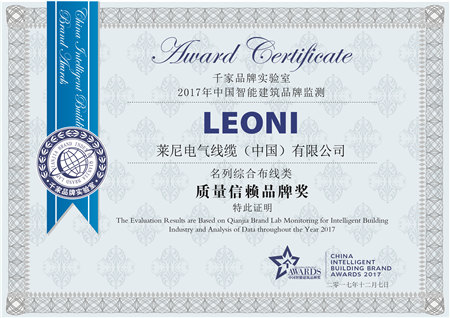 [導讀]在數十位建筑智能化專家、領導以及200多位智能化品牌企業高級管理人員的見證下,萊尼電氣線纜(中國)有限公司榮獲“2017年綜合布線質量信賴品牌獎”。