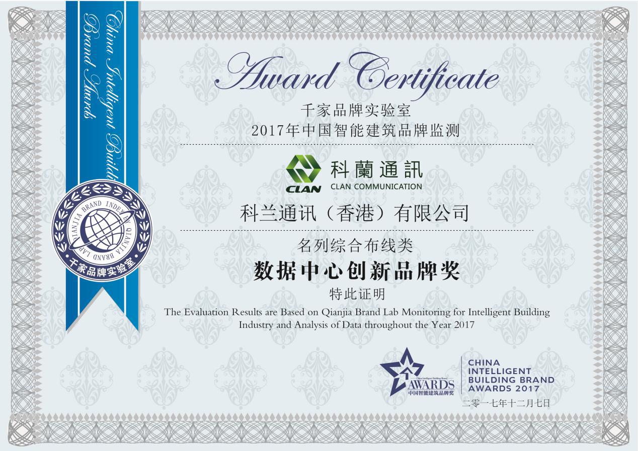 素有智能建筑行業"奧斯卡"之稱的"中國智能建筑品牌獎"頒獎典禮于2017年12月7日在廣州東方賓館盛大舉行,會上隆重揭曉了本年度智能建筑行業的各大獎項。經多方嚴格審核評選,科蘭榮獲"2017年綜合布線數據中心創新品牌獎"。
