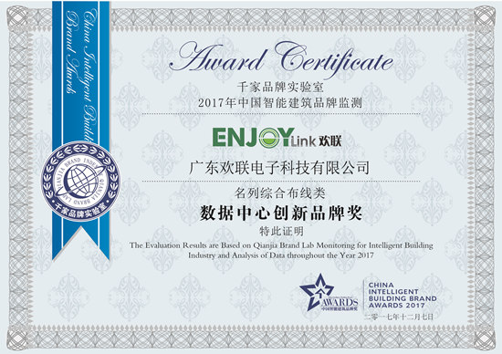 12月7日,2017年度中國國際建筑智能化峰會暨《中國智能建筑品牌獎》在美麗的羊城廣州隆重舉行。頒獎典禮上,ENJOY Link歡聯作為一家專門從事綜合布線的廠家,憑借自身的實力與不斷創新的精神,拿下了2017年綜合布線“領先品牌獎”與“數據中心創新品牌獎”雙項大獎。