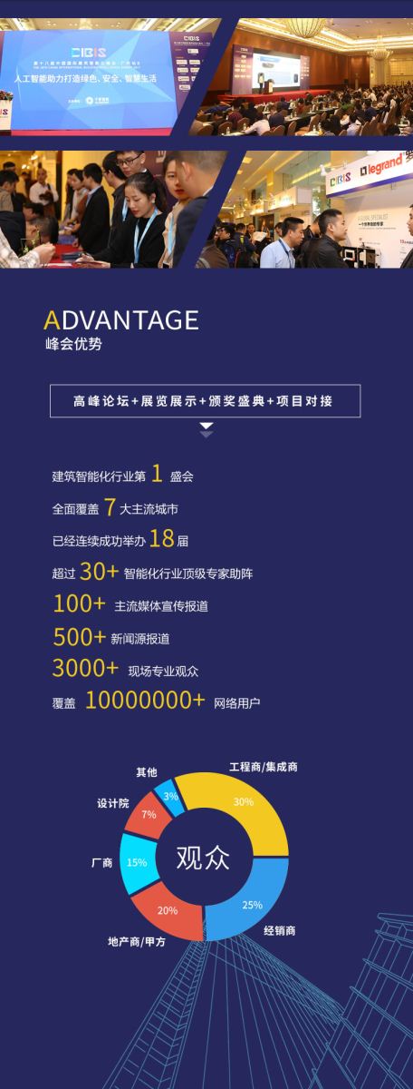 中國國際建筑智能化峰會是智能建筑行業每年一度的國際性盛會,被譽為智能建筑行業第一盛會,由千家智客策劃主辦,至今已有18年的歷史。峰會每年在北京、上海、廣州、杭州、武漢、成都、西安等全國重點城市舉辦,聚焦智慧城市、物聯網、大數據、人工智能等技術發布與應用,通過主題演講、現場展示、高端專訪等形式,每年吸引全國各地行業專家、設計院人士、系統集成商、渠道商、廠商、終端用戶等逾5000人參加。