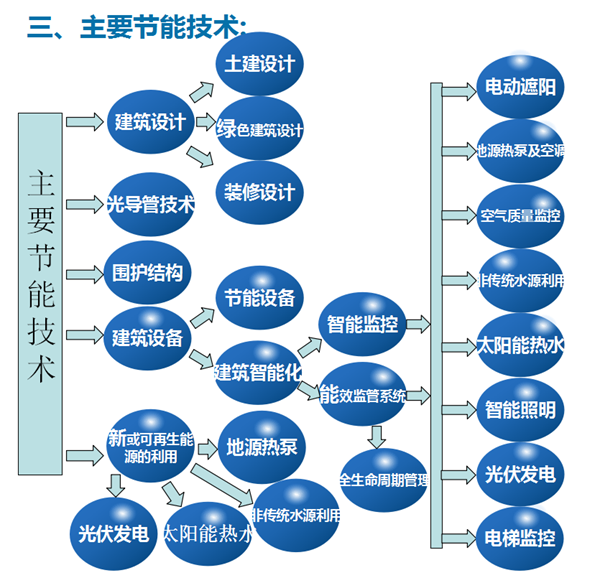 三、節能方面,包括斷橋鋁合金外窗及雙層中空玻璃,復合墻體與復合屋面保溫材料的選用;高效節能設備(如:能量回收系統、節能燈具、變頻電梯、光導管產品等)的選用;節能控制技術(電動遮陽、空調自動化系統、電梯群控等);可再生能源利用(太陽能、地源熱泵等)。