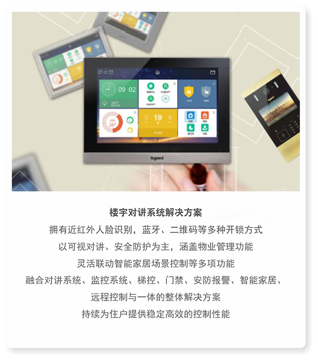樓宇對講作為羅格朗智能方面的核心業務之一,著力打造穩定可靠、擴展兼容性強的樓宇對講系統,從研發、制造、銷售到售后,每一個環節都精致嚴謹,秉承著為千家萬戶提供安全、舒適居家生活體驗的理念,不斷發展前行,在市場上獲得了眾多客戶的美譽和認可。