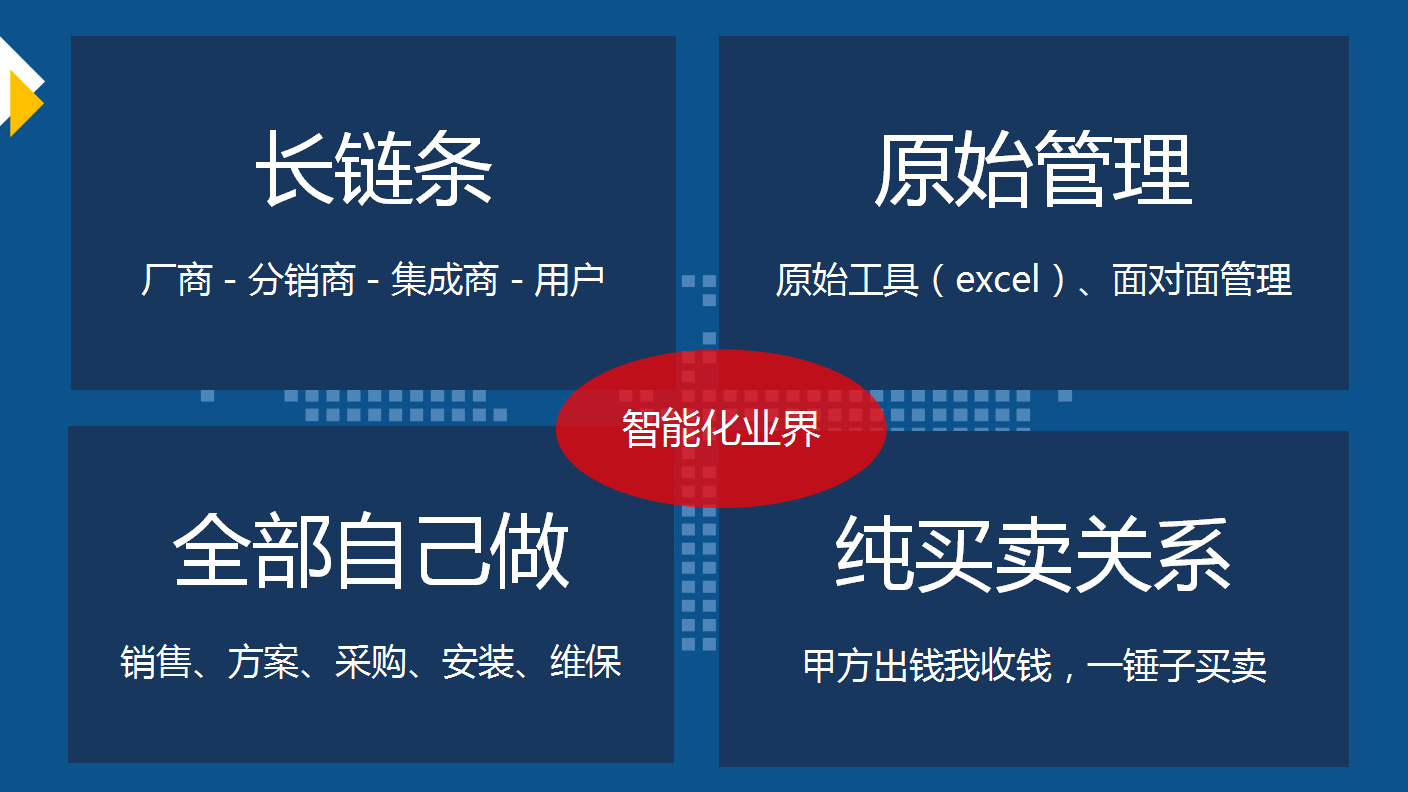 建筑智能化的長鏈條涵蓋了廠商、分銷商、集成商、用戶等,廠家需要區域、省市代理,代理商需要集成商將產品賣給用戶,因而,構成了建筑智能化的產業鏈。但目前,該領域還存在著不少問題,比如通過原始工具、面對面進行管理;或者是銷售、方案、采購、安裝、維保等親力親為,全部自己做;以及廠家和用戶的純買賣關系,甲方出錢再收錢,這是目前行業的普遍現狀。